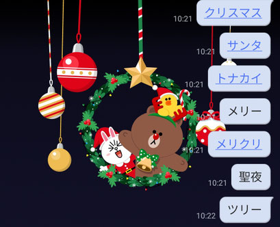 LINEで、クリスマスに関連する言葉が入ったトークを送ると、背景にクリスマスリースと飾りが表示されます(^ ^)/